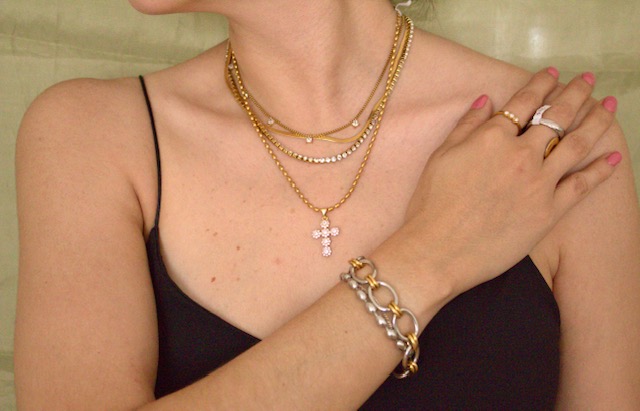 ¿qué mejor que una cruz de acero inoxidable y circonias de 5 cm? Perfecta para armar layerings creativos